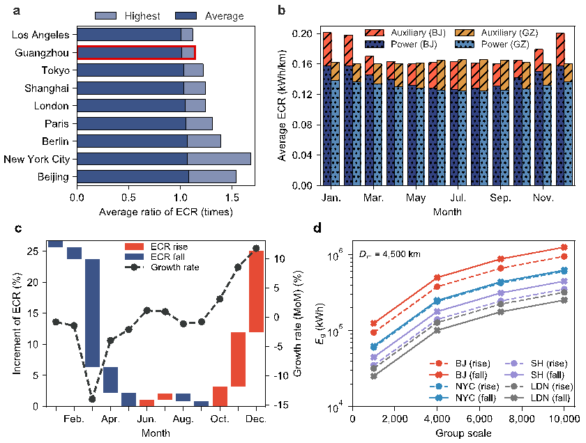随着世界范围电动汽车大规模部署,电动汽车行业对动力电池资源和城市能源的需求快速增长,评估城市电动汽车动力电池利用和能量消耗情况具有重要意义。该论文首次将电动汽车大数据引入到动力电池资源、城市能源相关领域,突破了电动汽车动力电池利用和能量消耗大规模评估的难题,对全球电动汽车大规模发展中所涉及的动力电池资源、能源、碳排放等方面研究具有重要意义。该论文通过结合大规模城市电动汽车数据、统计学方法和人工智能算法,报告了电动汽车大规模应用与小规模应用所不同的重要规律,如动力电池利用率差异性和电动汽车能量消耗季节性波动。引入气候数据,将模型拓展到世界多个地区,对比分析了电动汽车动力电池利用率、能耗相关重要规律在世界不同地域的差异性。例如,在北京地区,即使电动汽车的月行驶需求不变,季节变换带来的电动汽车群体平均能量消耗差异最高可达21%。
