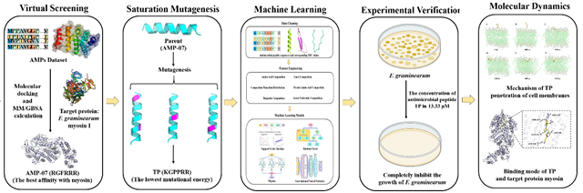 禾谷镰刀菌是一种广泛传播的土传真菌病原菌,其引起的赤霉病会导致小穗过早褪色,并导致种子败育、枯萎或尺寸减小,从而导致谷物产量和质量下降,对小麦生产具有毁灭性影响。针对此问题,团队通过人工智能模型与计算物理方法加速设计出了新型抗菌肽TP,仅需13.33微摩尔浓度即可近乎完全杀灭病原真菌禾谷镰刀菌。