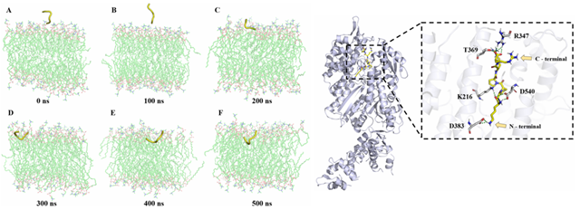 图2.抗菌肽TP的穿膜机制和与靶蛋白的结合模式