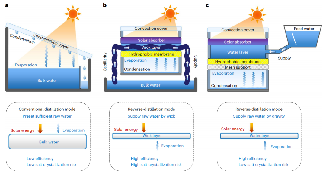 图1.太阳能驱动的蒸馏模式 (a)传统蒸馏;(b)基于亲水材料的逆向蒸馏;(c)基于水层的逆向蒸馏