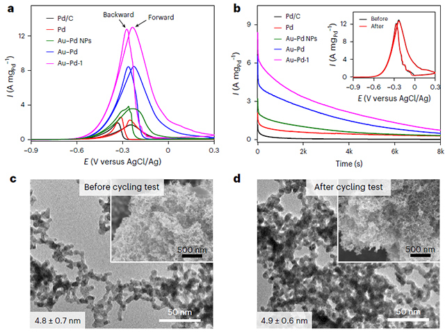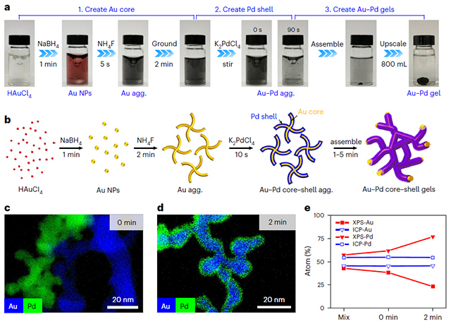 通过设计投料方式,可以调整多组分NMA的元素分布。例如,通过先共还原和后引发制备的Au-Pd凝胶显示出随机分布的Au和Pd。相比之下,采用动态成壳法(dynamic shelling approach)则可获得Au-Pd核壳结构气凝胶(图3)。