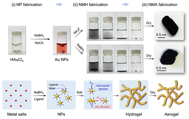 首先,文中展示了以NH4F或NaBH4为引发剂、柠檬酸三钠二水合物(NaCA)为配体制备金气凝胶的整个过程和相应机制。1)通过还原相应的金属盐制备金属NP溶液;2)通过添加普通盐从NP溶液中制备NMH。选择适当的盐类作为引发剂是该方法的核心。盐的加入可以同时诱导盐析效应和金属NPs的融合,促进NPs定向组装成结构可控的自支撑凝胶(图1)。